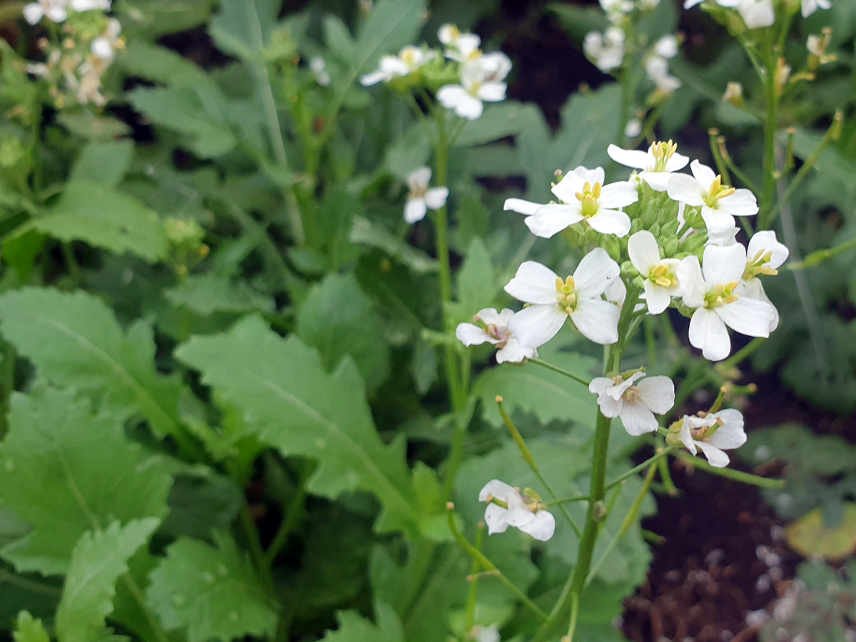 Samen der Wasabi- oder Meerrettichrauke, einer Wildrauke die ursprünglich im Mittelmeerraum beheimatet und mit der bekannteren Rucola verwandt ist. Die Wasabi-Rauke ist ein schnellwachsendes, anspruchsloses Salat- und Würzkraut mit scharfem und sehr typischem Wasabi- bzw. Meerrettich-Aroma. Ganzjährige Ernte der jungen, würzigen Blätter, in den Wintermonaten dafür im kalten Gewächshaus kultivieren. Vor allem in den Sommermonaten geht die Wasabi-Rauke rasch in Blüte, die Knospen und zierlichen weißen Blüten können jedoch ebenfalls verzehrt werden. Ein Schnitt der Knospen und Blüten fördert die weitere Blattbildung. Die Pflanzen samen sich bereitwillig selbst aus, wenn sie Samen bilden dürfen.