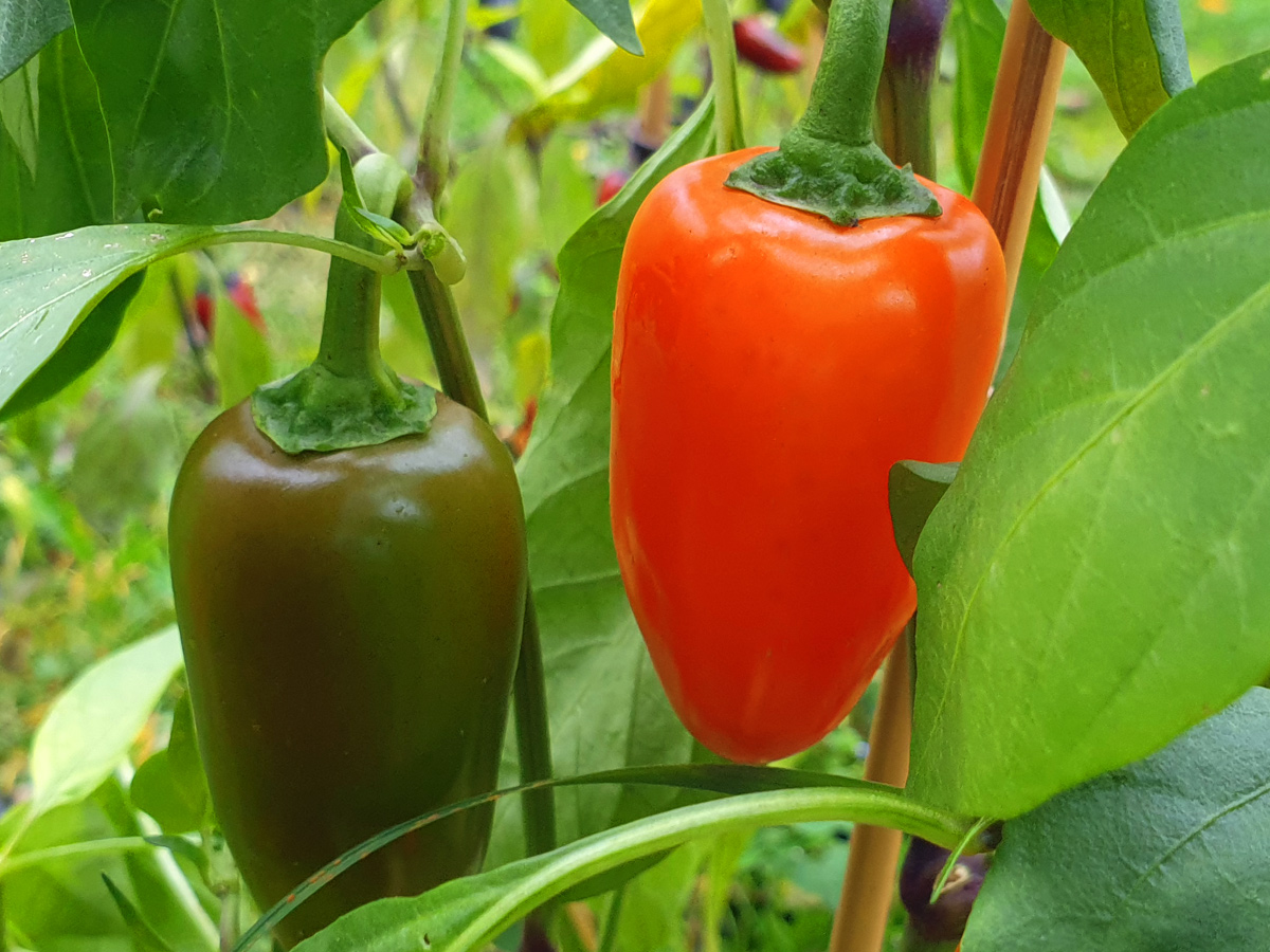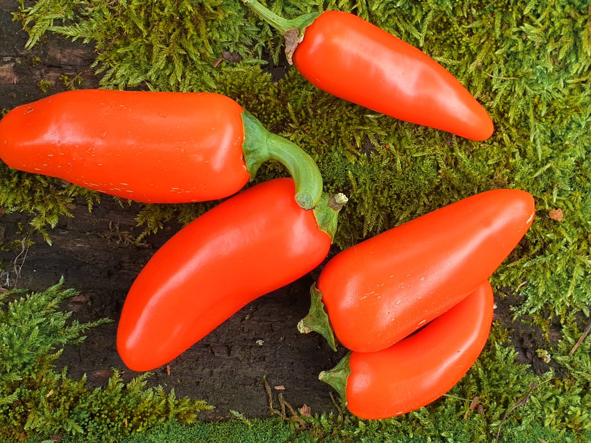 Samen Chili Jalapeño Orange. Leuchtend orangefarbener Jalapeño-Chili mit saftig-fleischiger Frucht. Typisch für Jalapeño sind die kurzen, stumpfen und dickwandigen Früchte, die ein erstaunlich hohes Fruchtgewicht aufweisen und eine Länge von 6 bis 9 cm erreichen. Aromatischer und fruchtiger Geschmack mit milder Schärfe. Reife von grün nach orange. Wüchsige Chili-Pflanzen, die viele Früchte produzieren und relativ einfach in der Kultur sind. Empfehlenswert für die Topfkultur oder im Freiland an einem sonnigen und warmen Platz.